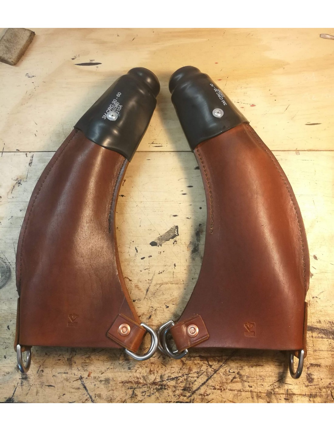 Emboulages en cuir : cuir naturel ou chromé, bouclerie en acier inoxydable, renfort métalique et gaine thermorétractable